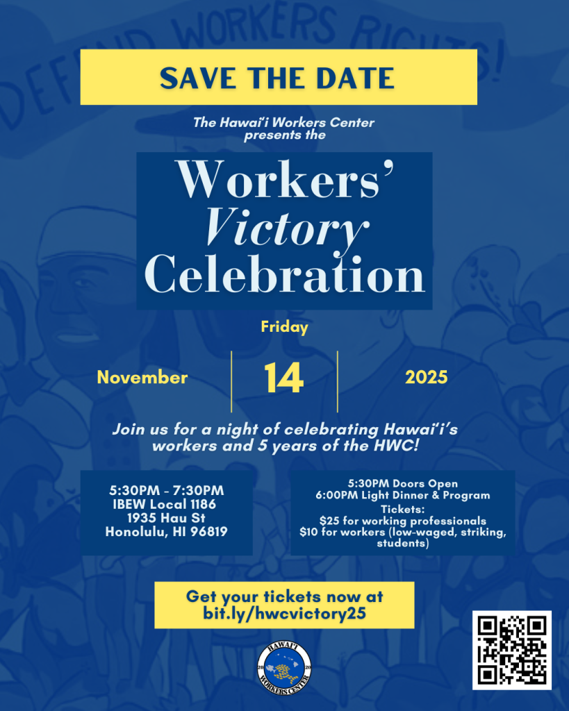 November 14th, 2025: Workers’ Victory Celebration – Celebrating 5 Years of the Hawaiʻi Workers Center! Get your tickets now!