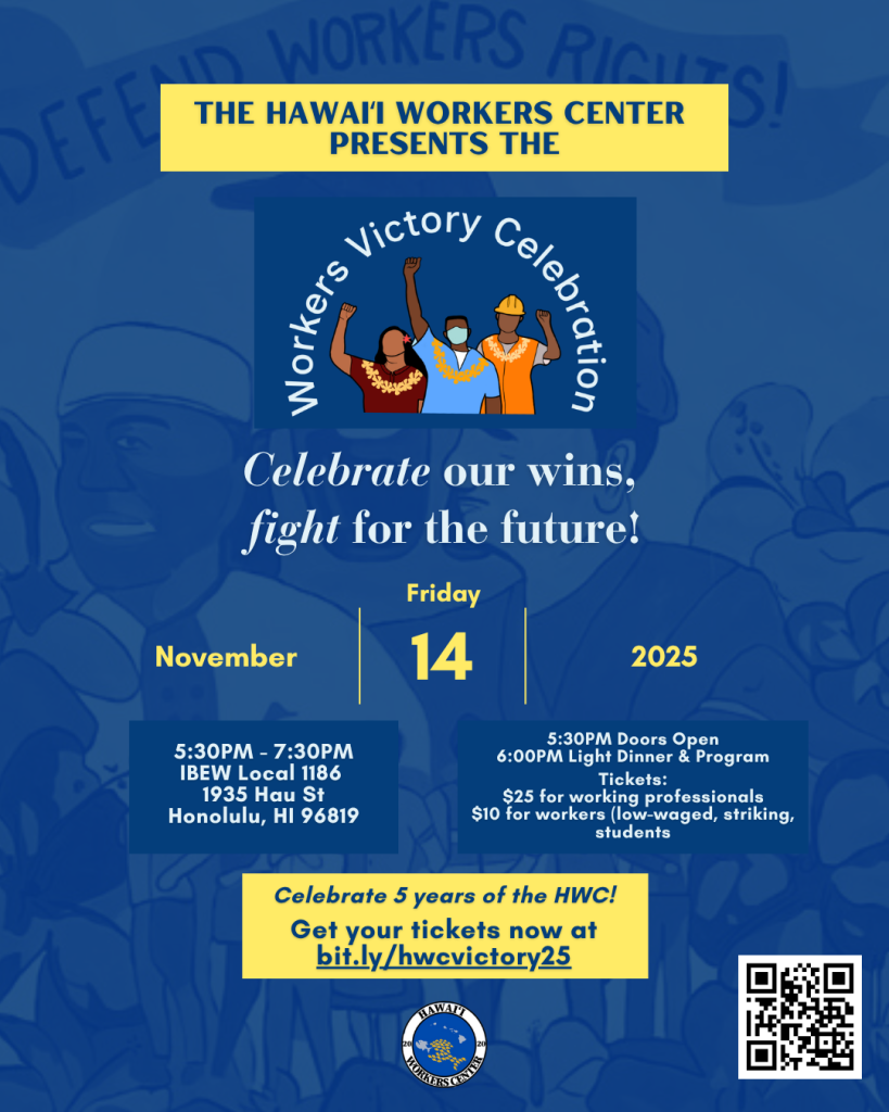 The Hawaiʻi Workers Center is excited to announce the theme for our upcoming Workers Victory Celebration: “Celebrate our wins, fight for the future!”